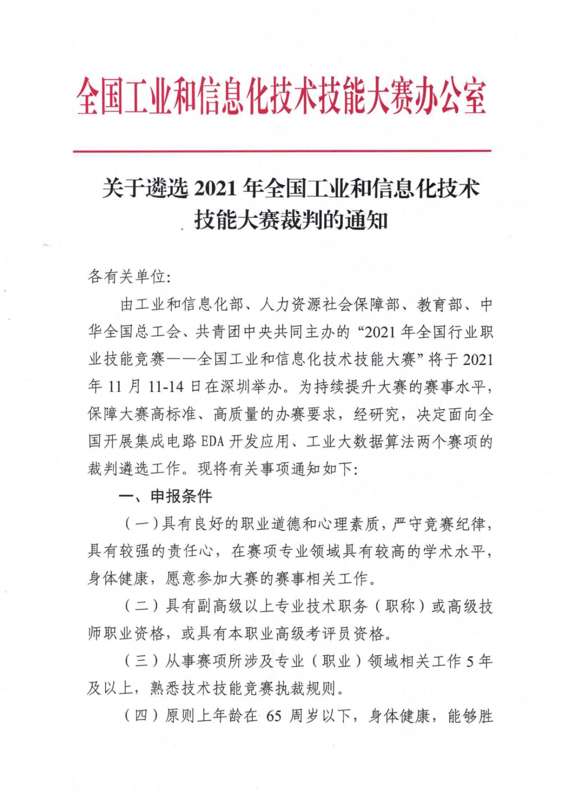 關(guān)于遴選2021年全國(guó)工業(yè)和信息化技術(shù)技能大賽裁判的通知
