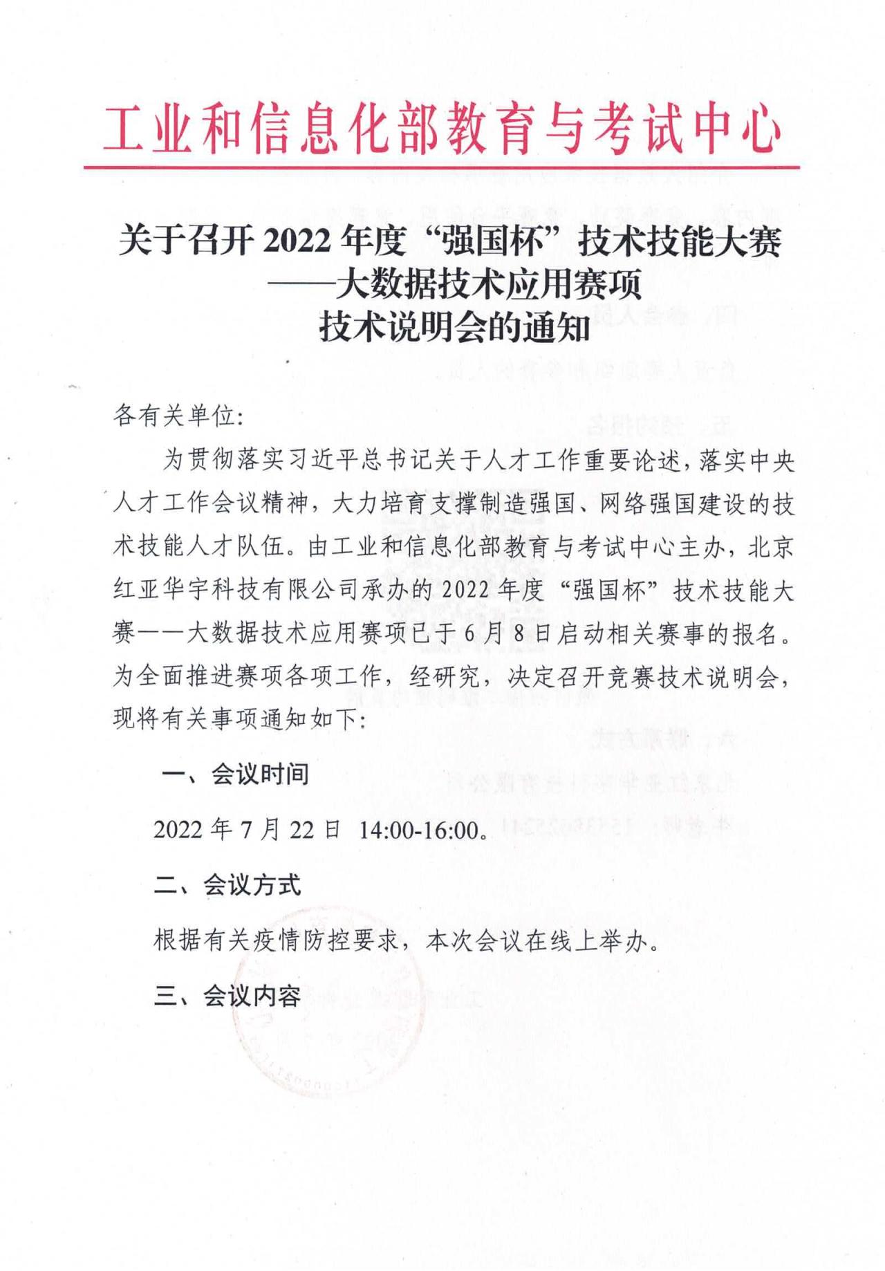 通知下載:關(guān)于召開(kāi)2022年度“強(qiáng)國(guó)杯”技術(shù)技能大賽——大數(shù)據(jù)技術(shù)應(yīng)用賽項(xiàng) 技術(shù)說(shuō)明會(huì)的通知.pdf