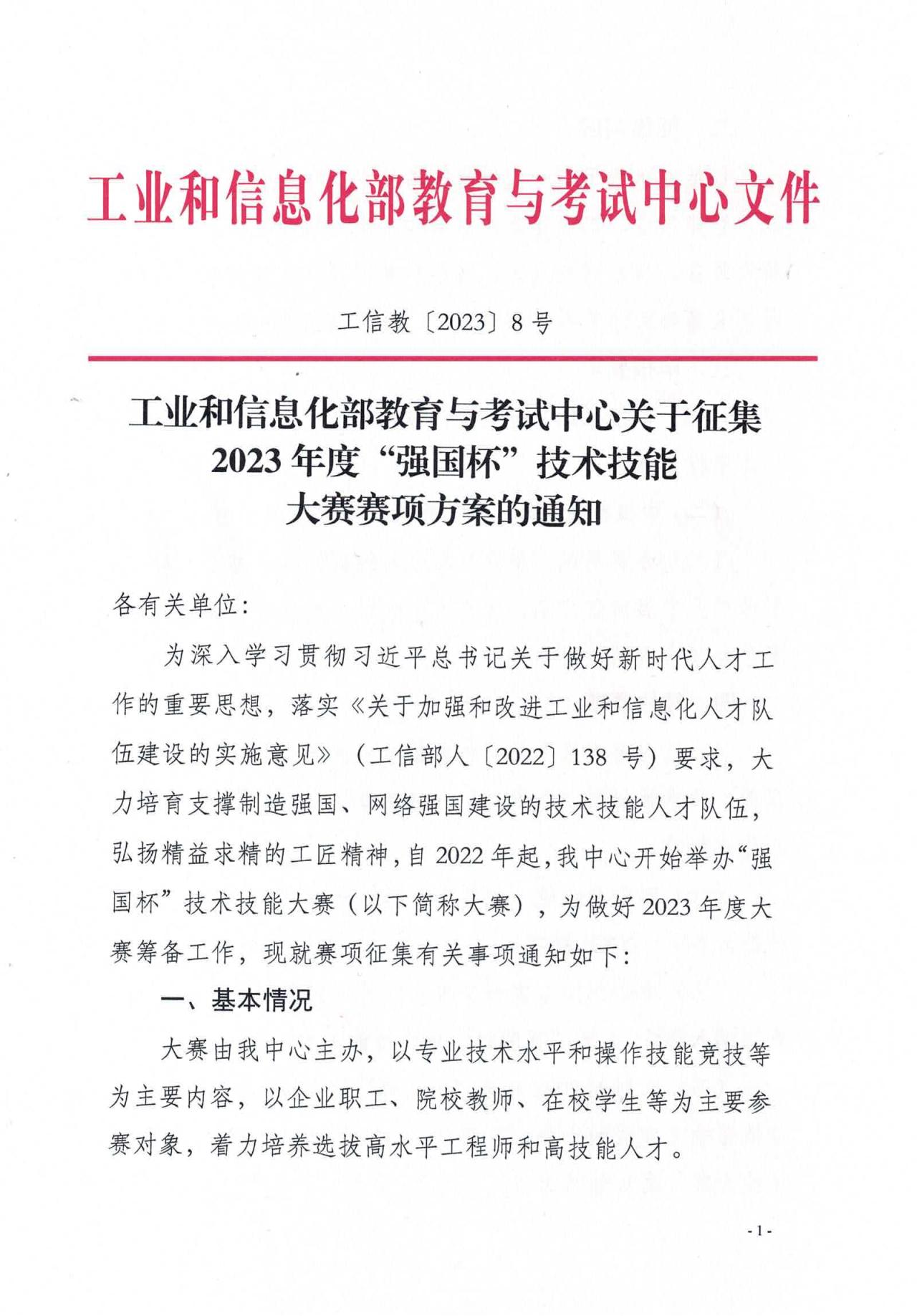 工業(yè)和信息化部教育與考試中心關(guān)于征集2023年度“強(qiáng)國(guó)杯”技術(shù)技能 大賽賽項(xiàng)方案的通知