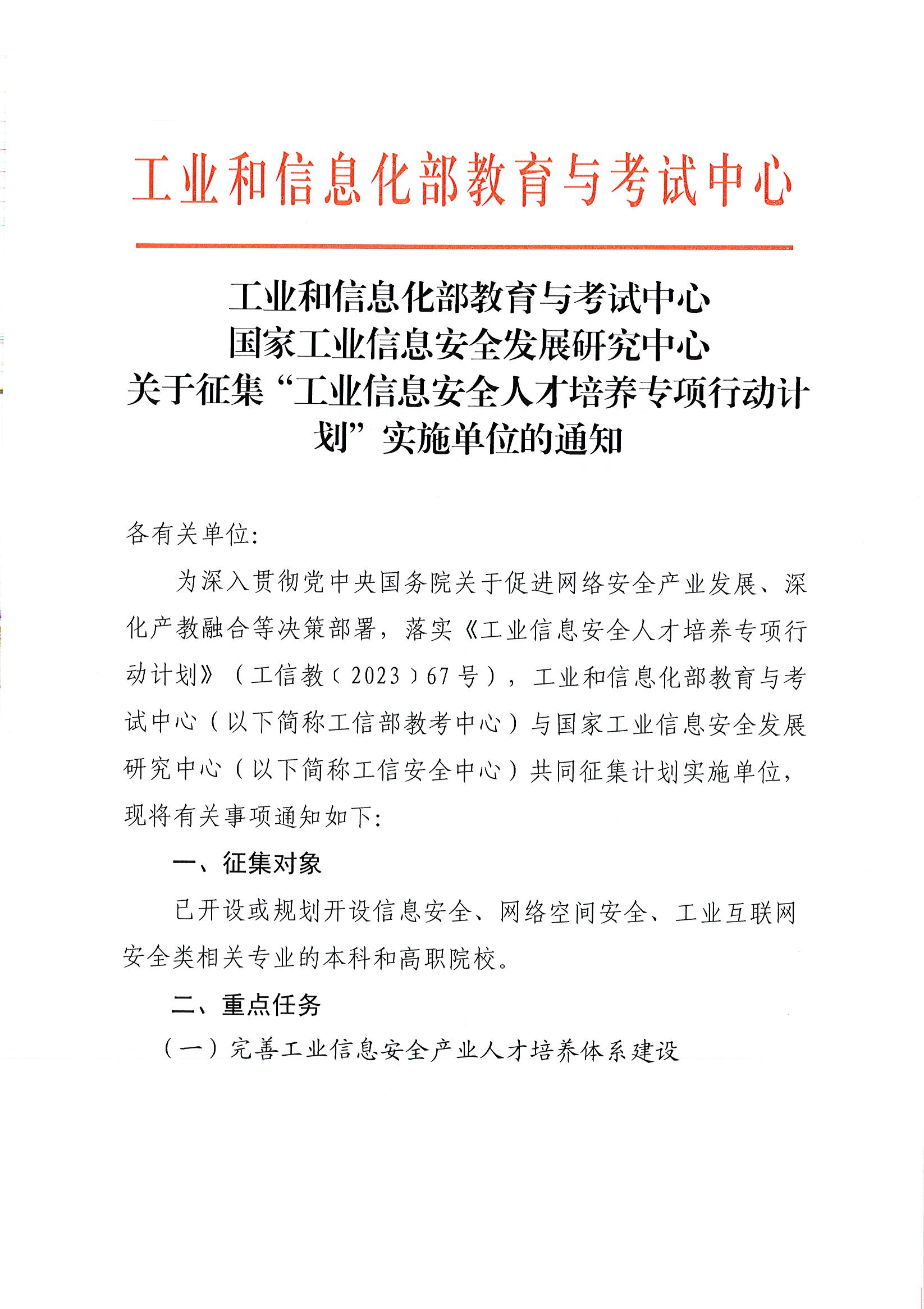 關(guān)于征集“工業(yè)信息安全人才培養(yǎng)專項行動計劃”實施單位的通知