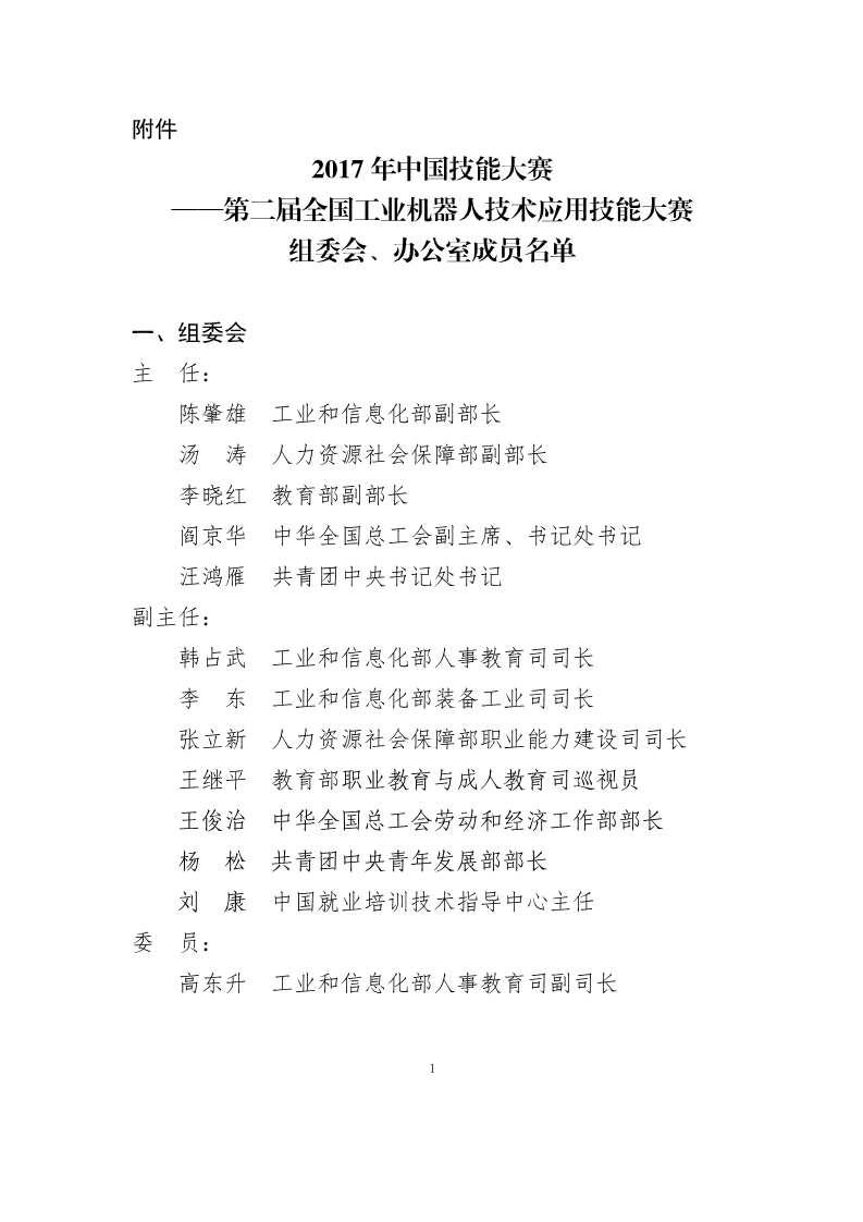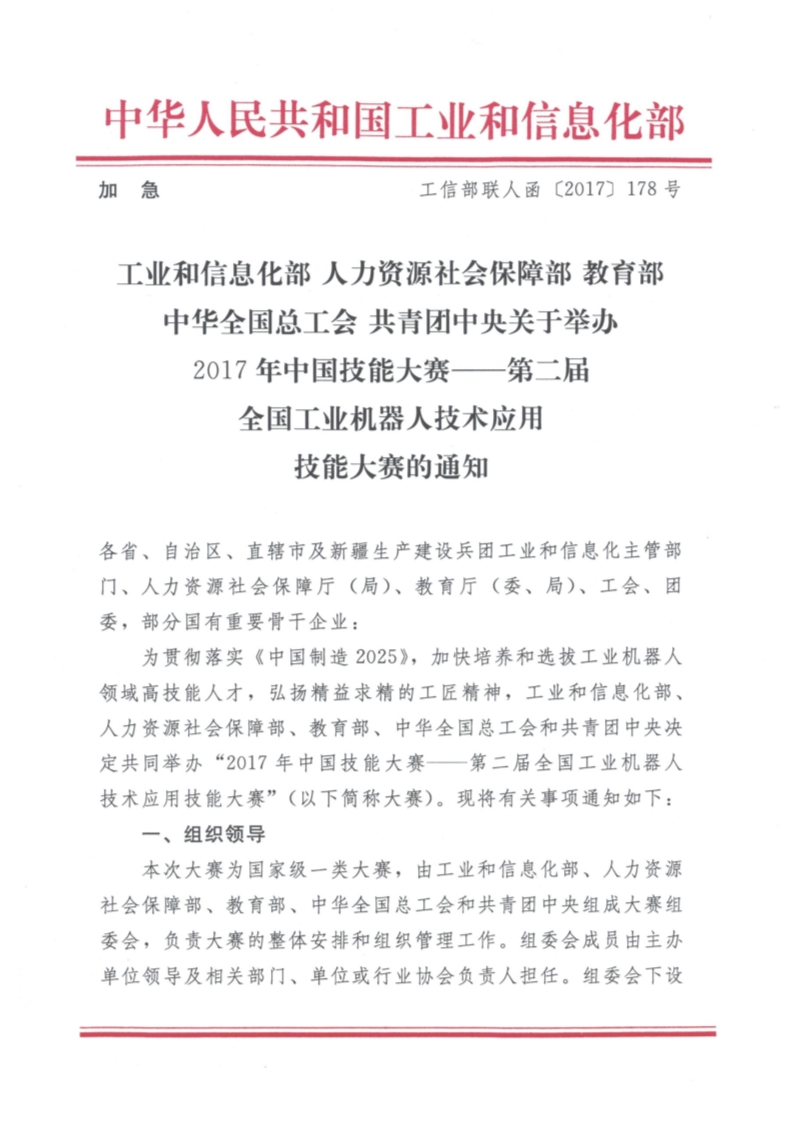 工業(yè)和信息化部 人力資源社會保障部 教育部 中華全國總工會 共青團中央關于舉辦2017年中國技能大賽——第二屆全國工業(yè)機器人技術應用技能大賽的通知