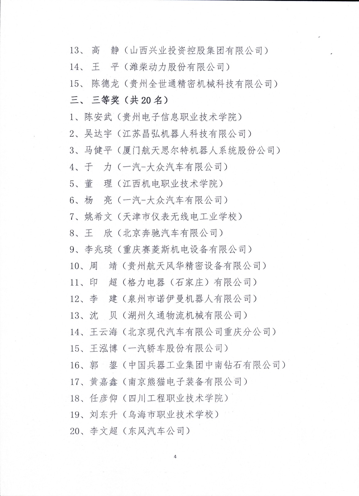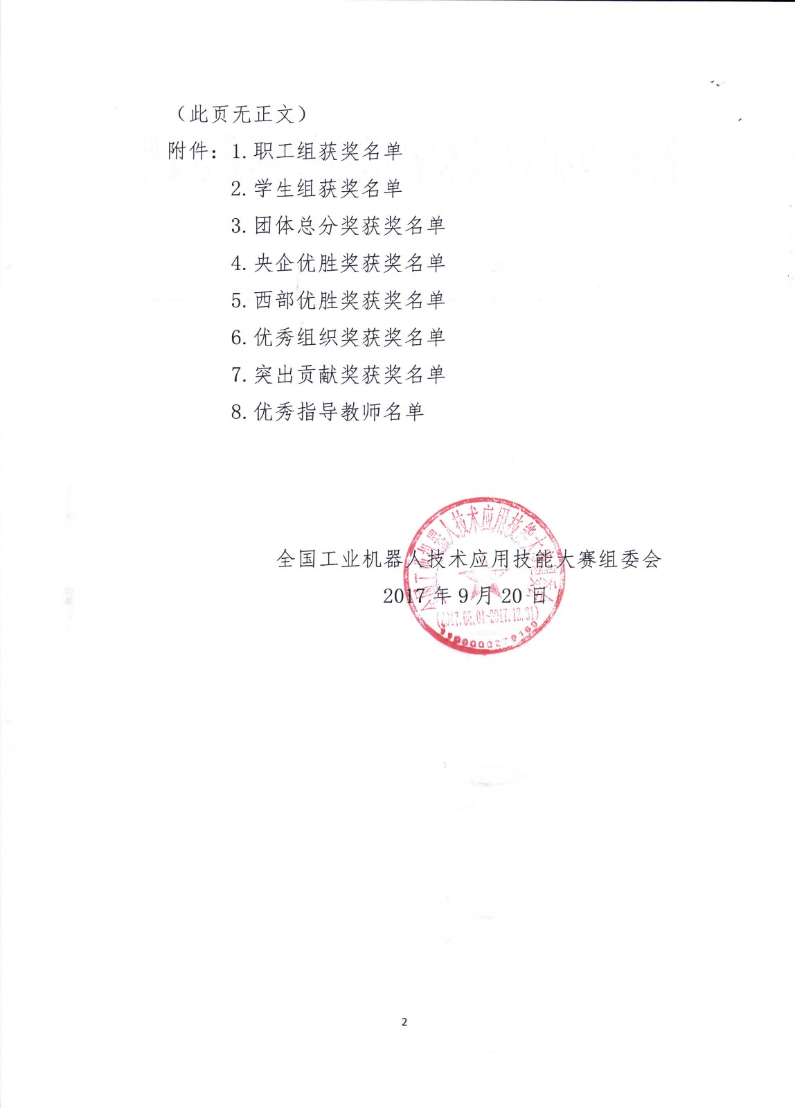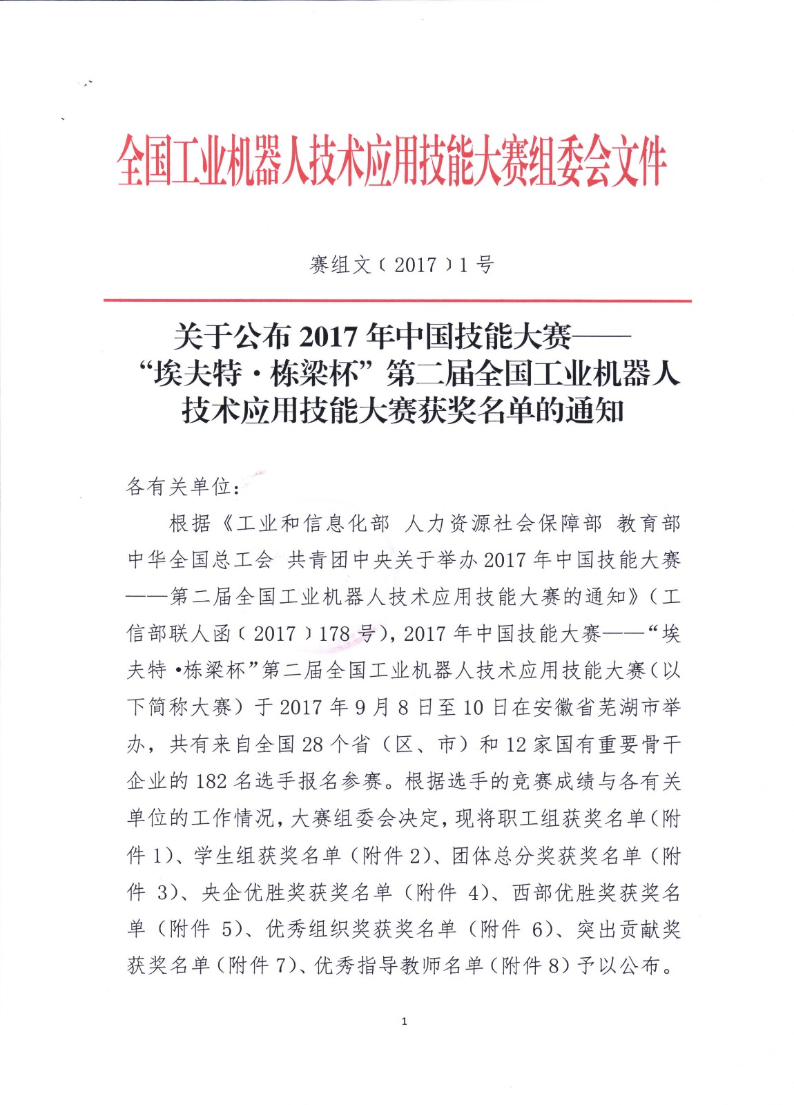 關(guān)于公布2017年中國(guó)技能大賽——“埃夫特?棟梁杯”第二屆全國(guó)工業(yè)機(jī)器人技術(shù)應(yīng)用技能大賽獲獎(jiǎng)名單的通知