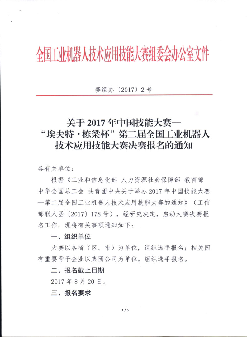 關(guān)于2017年中國技能大賽——“埃夫特?棟梁杯”第二屆全國工業(yè)機器人技術(shù)應(yīng)用技能大賽決賽報名的通知