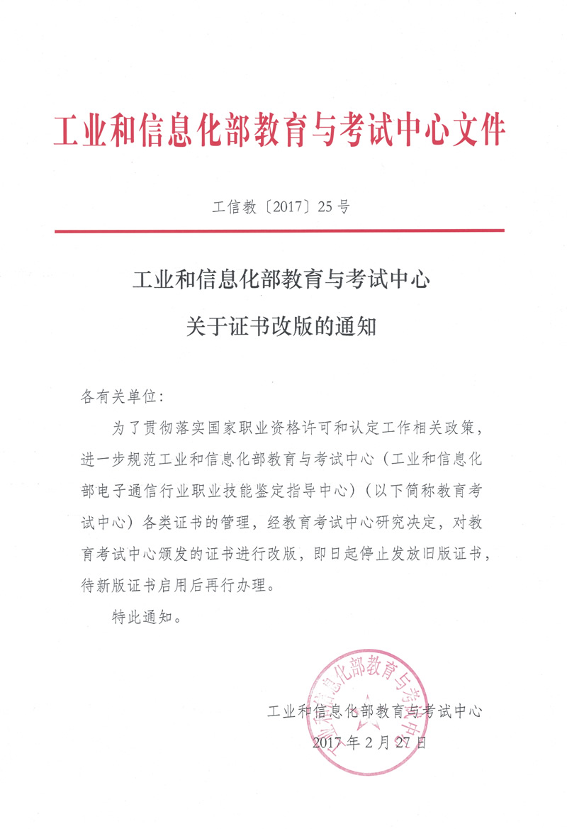 工業(yè)和信息化部教育與考試中心關于證書改版的通知