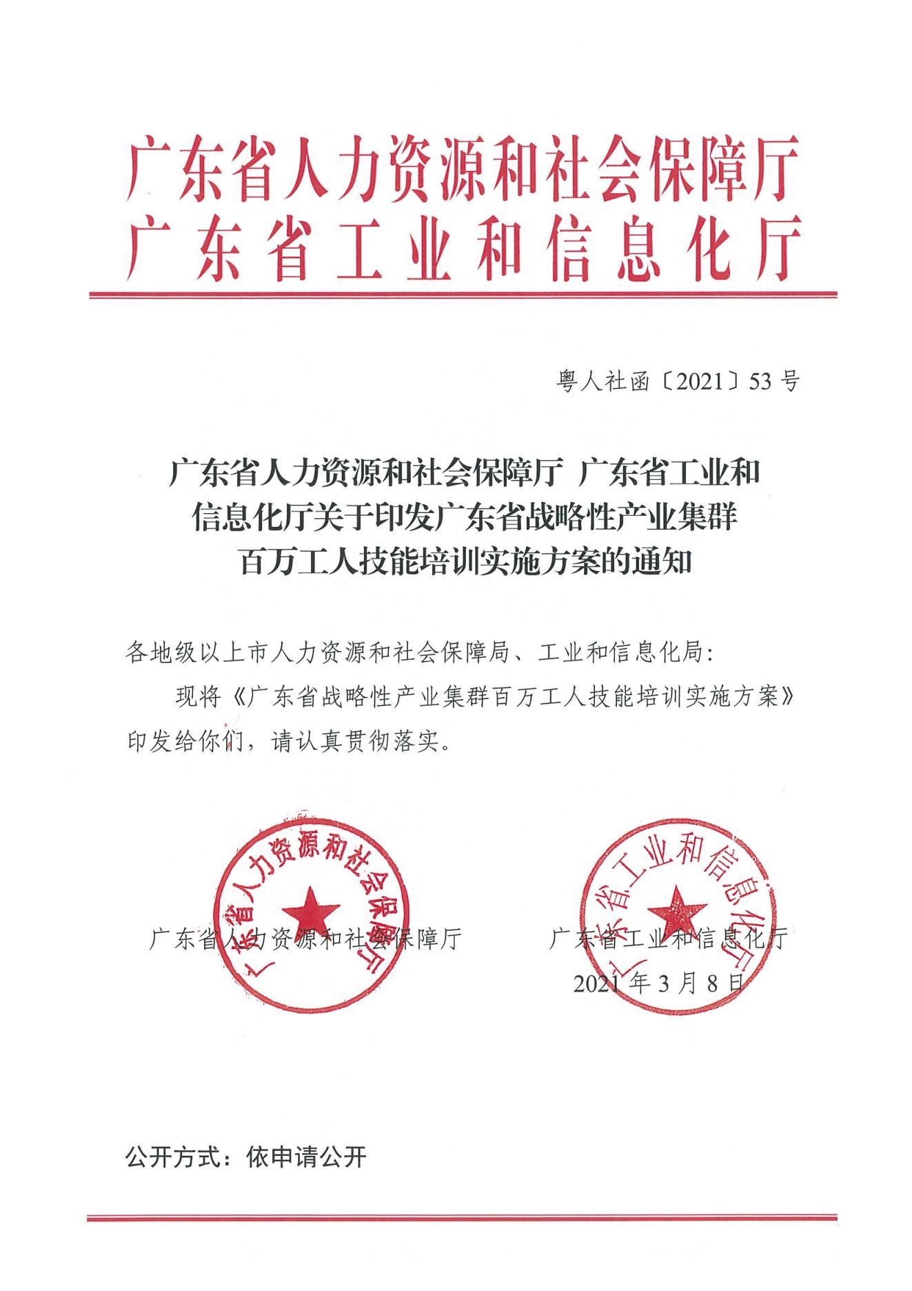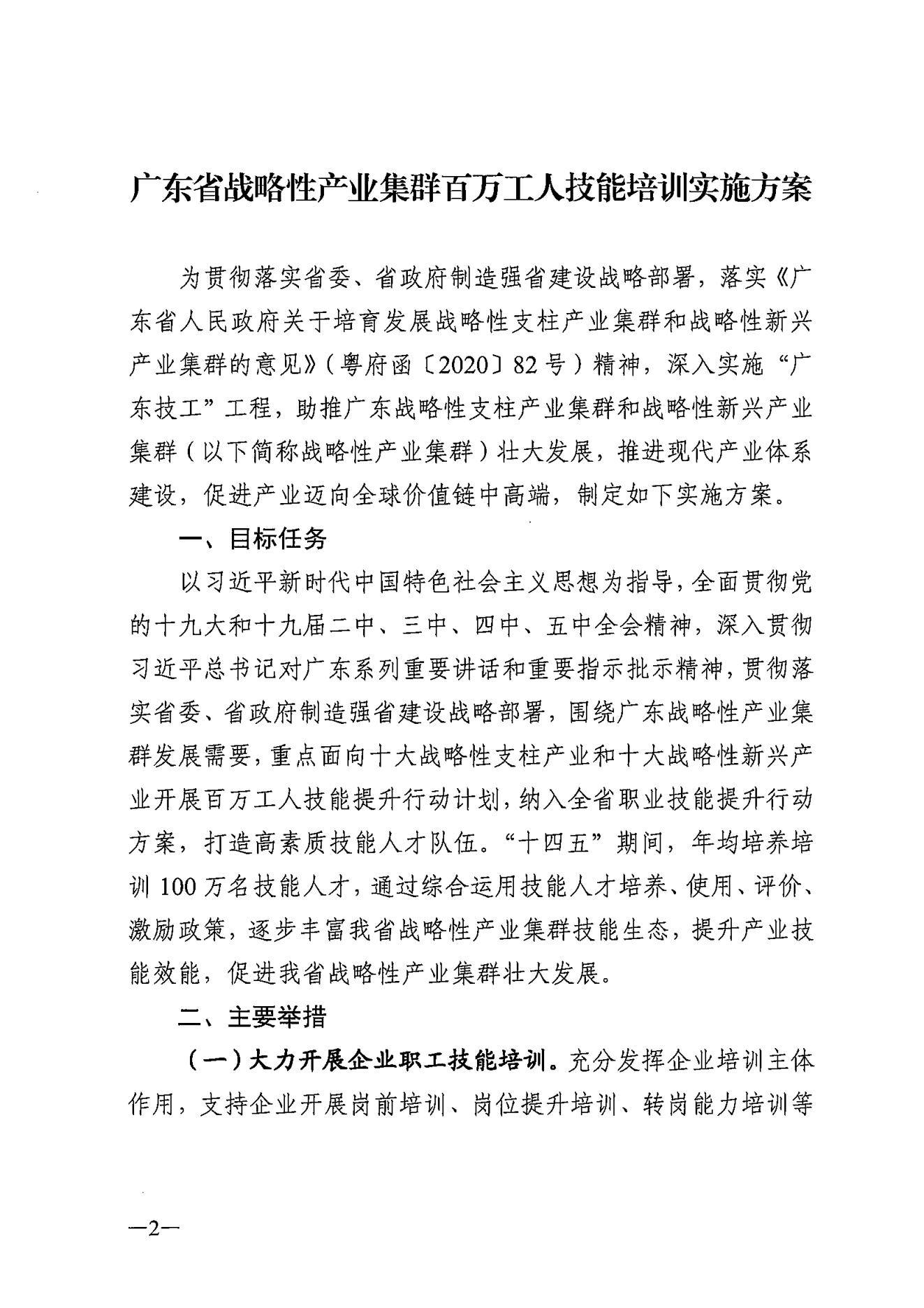廣東省人力資源和社會保障廳 廣東省工業(yè)和信息化廳關于印發(fā)廣東省戰(zhàn)略性產業(yè)集群百萬工人技能培訓實施方案的通知
