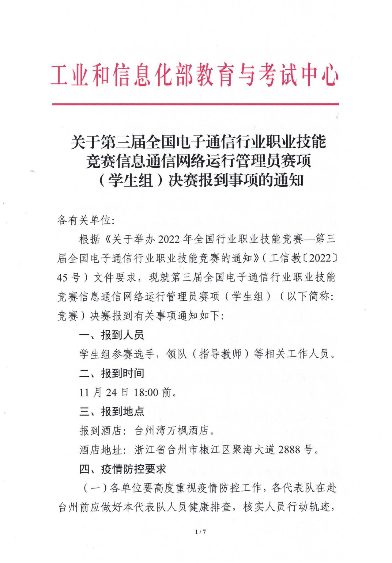 關(guān)于第三屆全國電子通信行業(yè)職業(yè)技能競賽信息通信網(wǎng)絡(luò)運行管理員賽項(學生組)決賽報到事項的通知