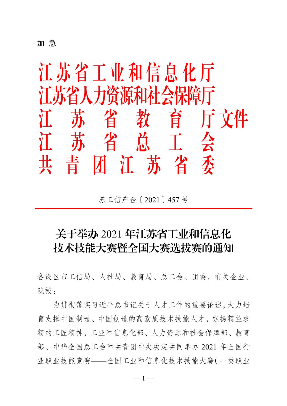 江蘇省2021年全國工業(yè)和信息化技術(shù)技能大賽選拔賽通知