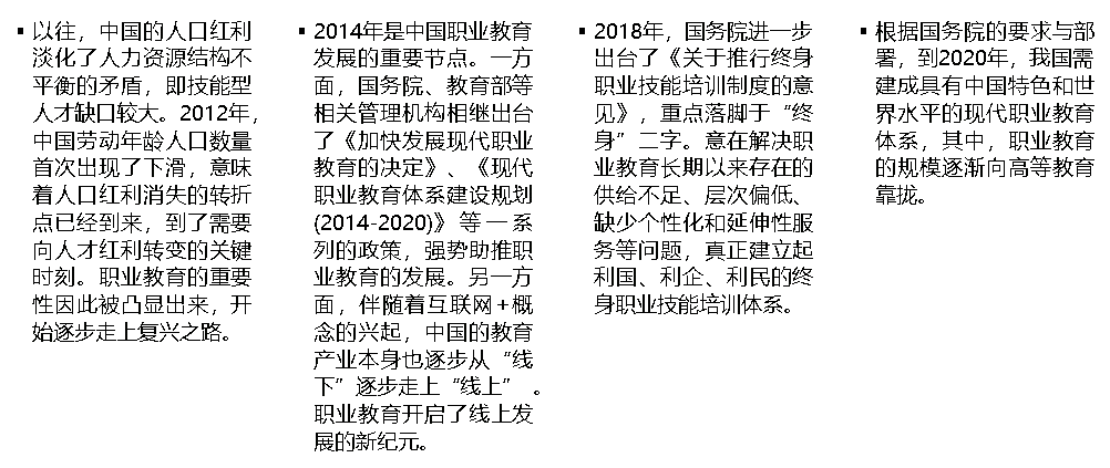 在線(xiàn)職業(yè)教育屬于教育的范疇,由于商業(yè)模式 相對(duì)固化,社會(huì)價(jià)值沒(méi)有被充分釋放。
