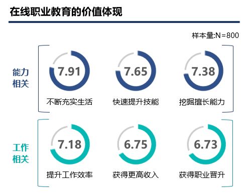 從數(shù)據(jù)來(lái)看,相較于生活和個(gè)人能力的角度,學(xué)員整體上認(rèn)為目前在線(xiàn)職業(yè)教育“就業(yè)教育”導(dǎo)向還有更大的發(fā)揮空間和市場(chǎng)潛力,用戶(hù)對(duì)在線(xiàn)職業(yè)教育提升工作效率、獲得更高收入以及獲得職業(yè)晉升的三種價(jià)值體現(xiàn)評(píng)價(jià)分別在7.18、6.75.和6.73 。