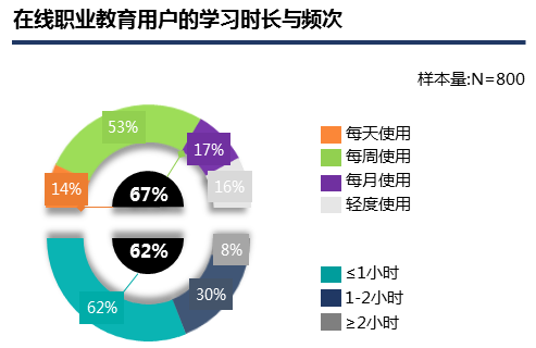 能夠充分利用碎片化時(shí)間,不受場(chǎng)景和場(chǎng)地的限制。調(diào)研顯示,67%的受訪(fǎng)用戶(hù)都體現(xiàn)出了高頻的特征,分別14%和53%的用戶(hù)表示每天和每周都在使用平臺(tái)進(jìn)行學(xué)習(xí)。