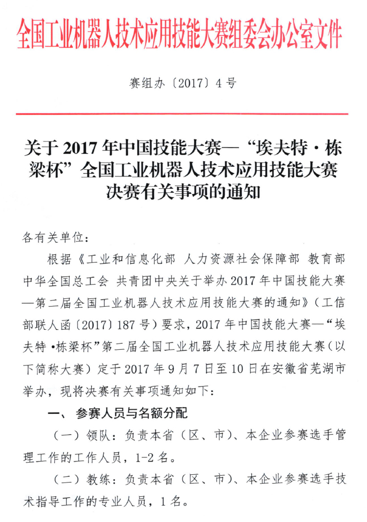 關(guān)于2017年中國技能大賽--“埃夫特·棟梁杯”全國工業(yè)機(jī)器人技術(shù)應(yīng)用技能大賽決賽有關(guān)事項(xiàng)的