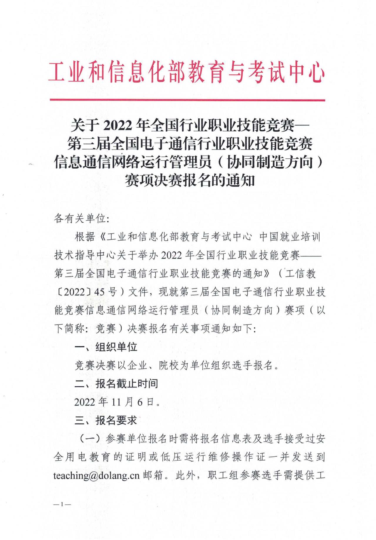 通知下載:關(guān)于第三屆全國(guó)電子通信行業(yè)職業(yè)技能競(jìng)賽信息通信網(wǎng)絡(luò)運(yùn)行管理員(協(xié)同制造方向)賽項(xiàng)決賽報(bào)名的通知.pdf
